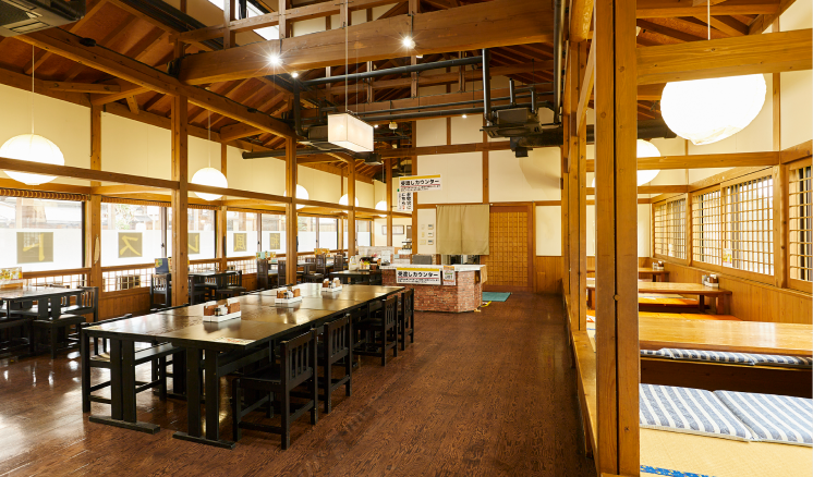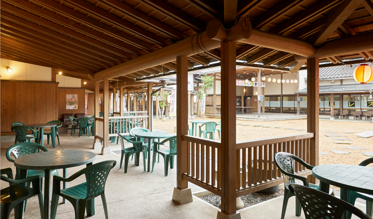 中庭を囲う軒下にテーブルやイスを設置しています。お食事や休憩などごゆっくりとご利用ください。