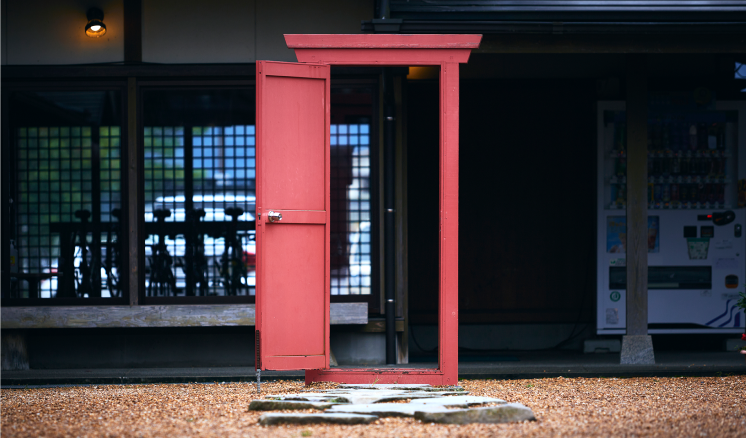 中庭へ入ると突如現れるピンク色のドア! ドア越しに記念撮影したり、ドアから延びる石畳でケンケンパをしたりと人気のスポットです。