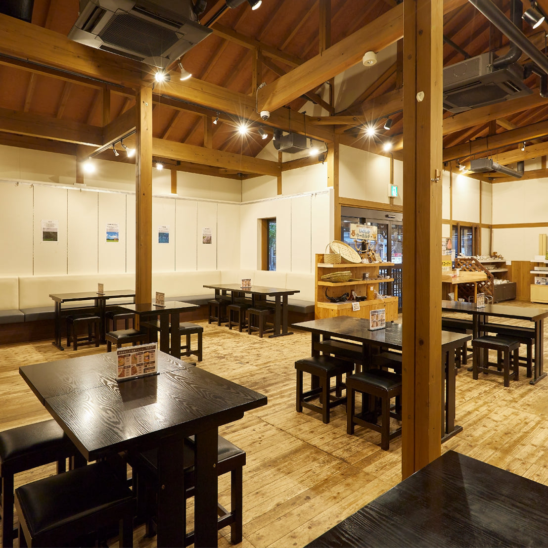 朝採れ野菜コーナーとお土産コーナーを抜けた奥にある喫茶「せせらぎ」。地元の素材を使用した豚丼、うどんなどの軽食や梨ソフトクリーム、旬の地元食材を使用したオリジナルのアイスクリームなど、こだわりのメニューを気軽にお楽しみいただけます。